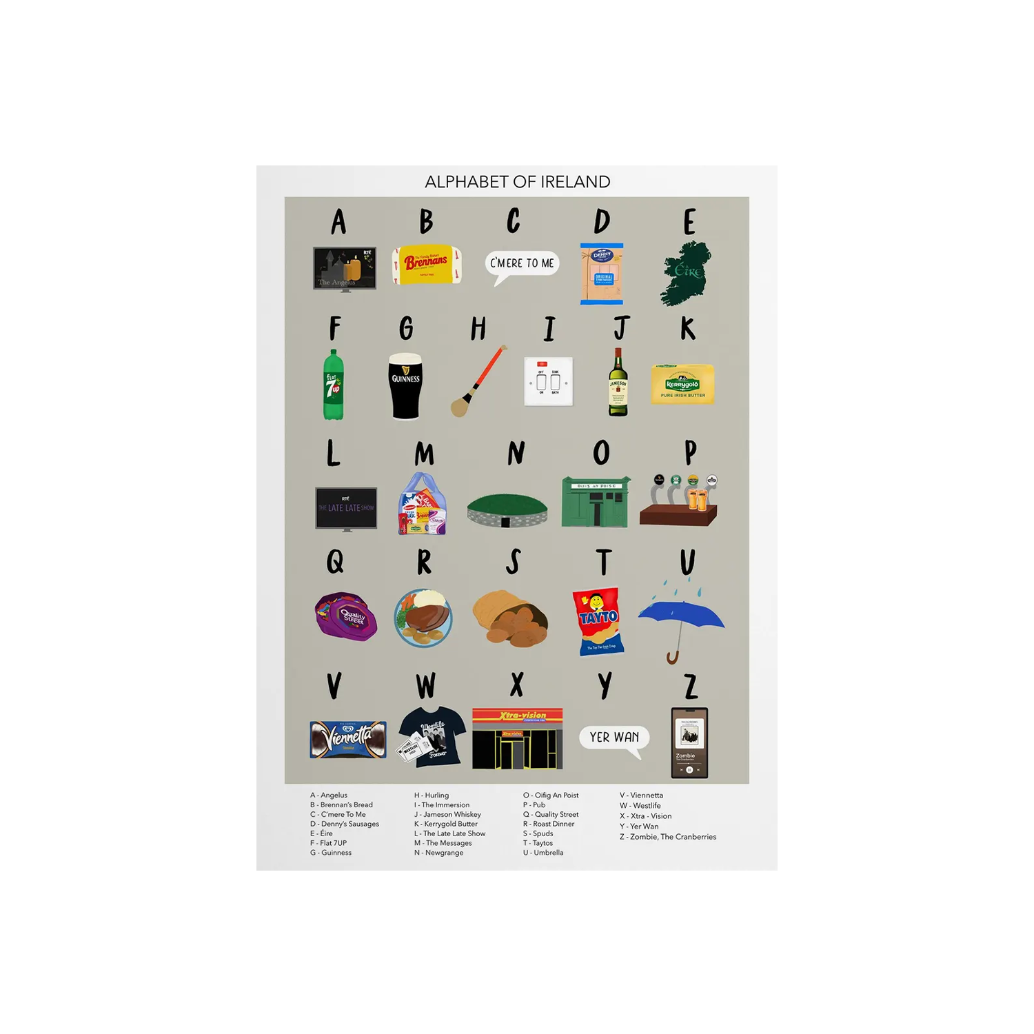The Irish Alphabet, a fun and detailed illustration print full of the A to Z of Ireland. From The Angelus all the way to Zombie by the Cranberries, with Kerrygold butter, Taytos, hurling and Westlife in between.