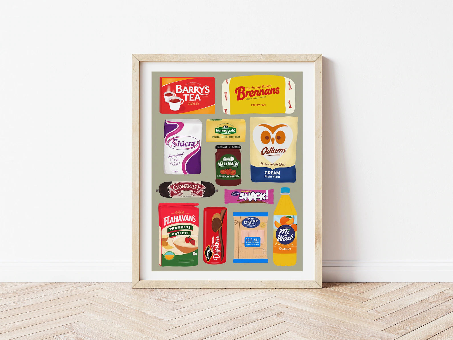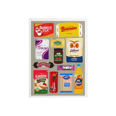 An illustration print of all the Irish food essentials. Kerrygold butter, Barrys Tea, Oldlums flour, Clonakilty Pudding, Denny's Sausages and so many more beloved food's from Ireland. A bright and detailed print for the walls of your home or a thoughtful gift for any Irish living abroad.