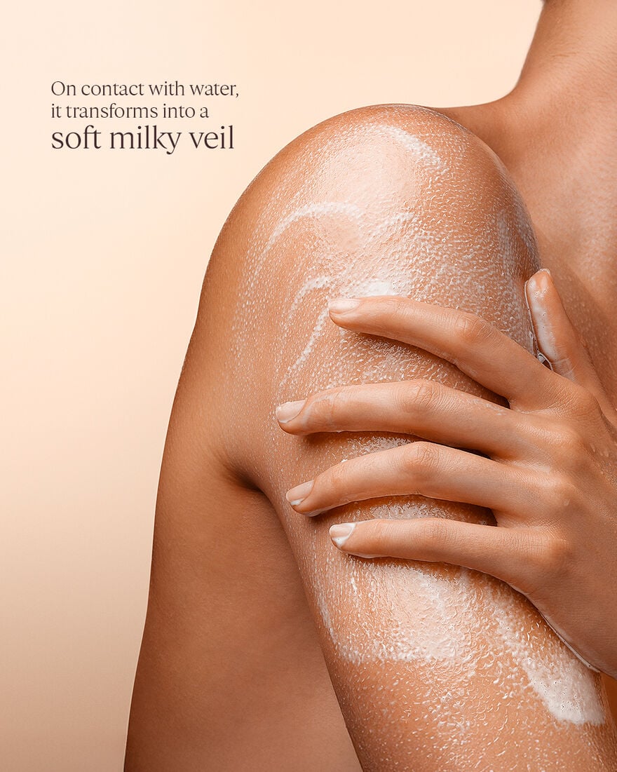 In contact with water, this golden oil transforms into a delicate milky veil that gently cleanses and moisturises the skin.