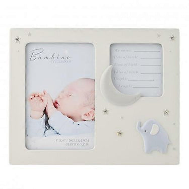 A Bambino BY JULIANA Data Photo Frame with Elephant Icon, a lovely addition to any nursery display. Crafted from high-quality resin and glass, the design consists of petite shiny stars, a grey crescent moon and a baby blue elephant. These delightful embellishments complement the 4 x 6 / 10cm x 15cm aperture size. Above the moon is a titled space where details of the birth can be written. A perfect choice for those seeking stylish baby and nursery products to offer their customers. 100 x 75 x 75mm (HWD)