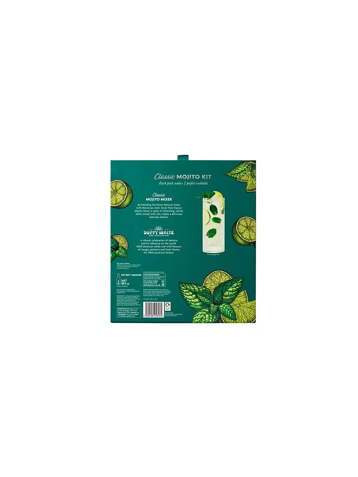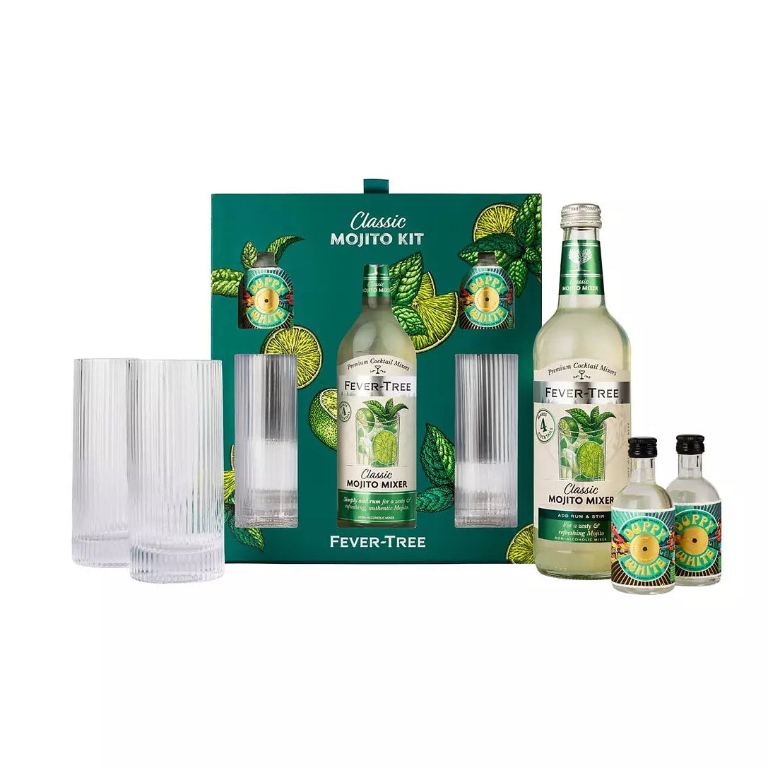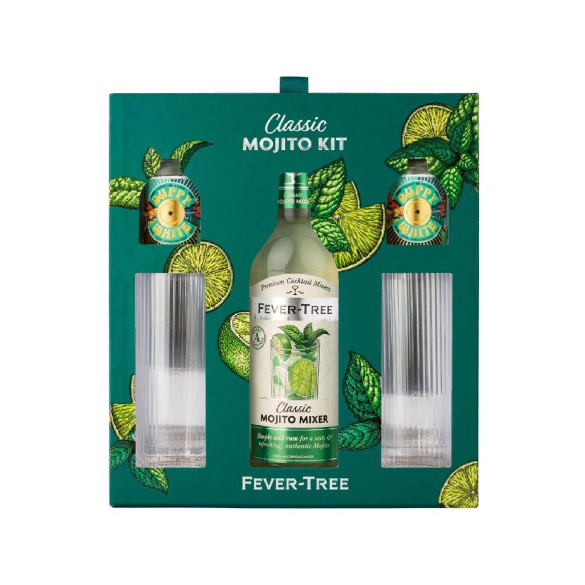 • Includes 2 x 50ml Duppy Share White Rum (ABV 40%), 1 x 500ml Fever-Tree Mojito Mixer and 2 x premium ribbed high-ball glasses.
