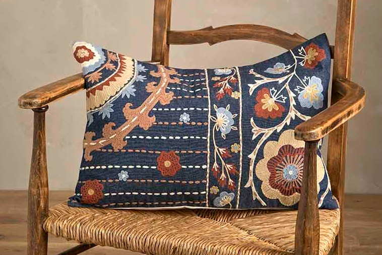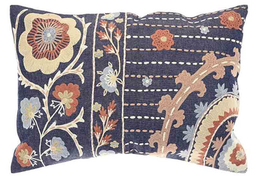 A rectangular cushion featuring an embroidered suzani design.  Zip closure for easy removal of the pad.