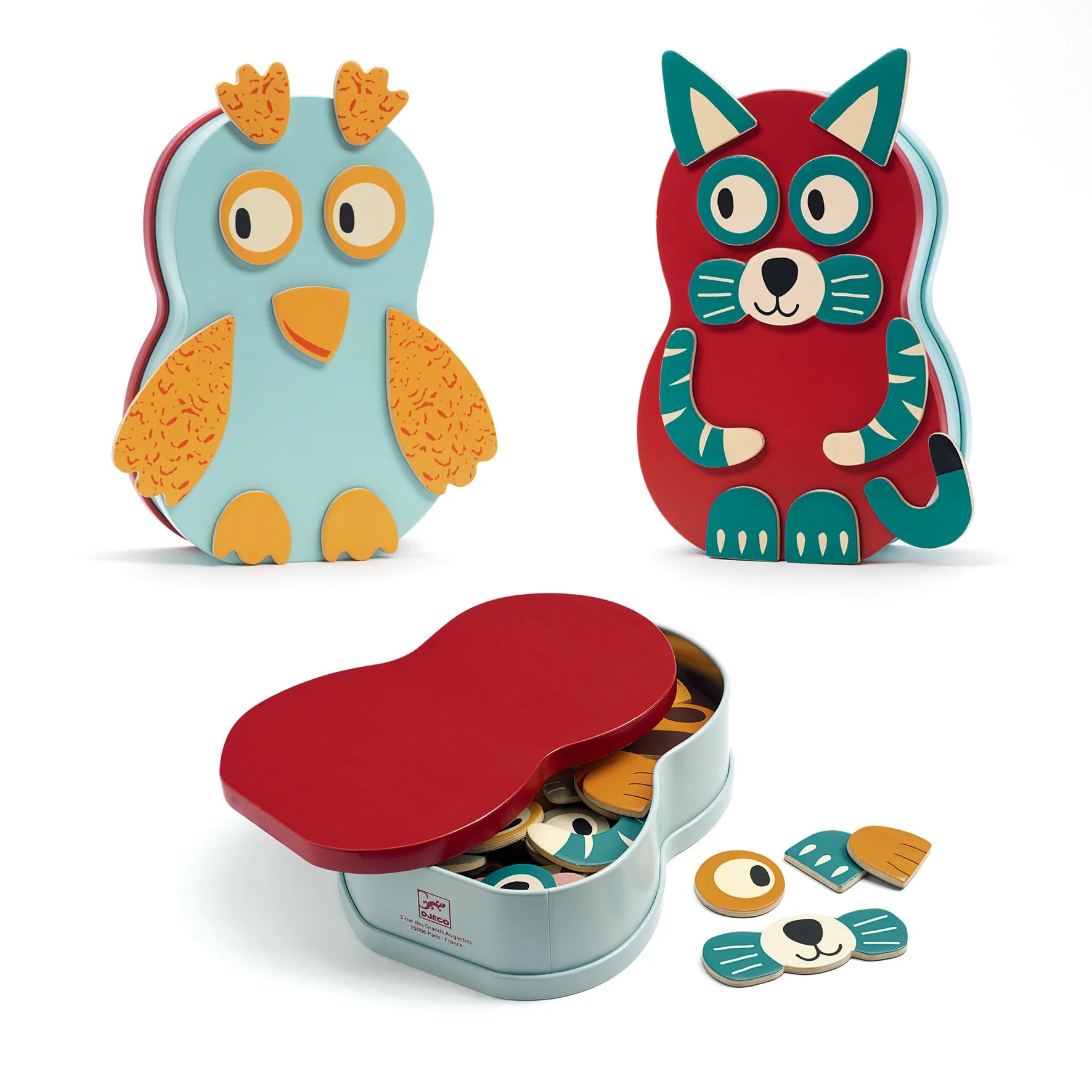 Inzebox, a new way to play with magnets! A metal box on which the child places magnetic wooden pieces to have fun creating a rabbit, a cat, an owl, a beaver or much more!