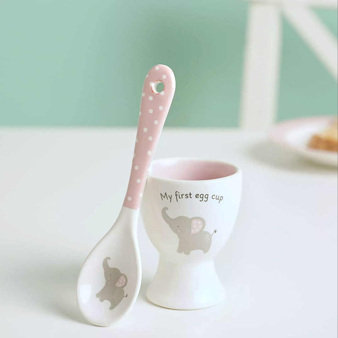 Make breakfast extra special with this adorable ceramic Hello Baby 2 Piece Egg Cup & Spoon Set - Pink. Featuring a pink and white colour palette, a cheerful elephant design, and the message “My first egg cup”, it’s perfect for a little one’s first dippy eggs. Sized just right for small hands, it makes a thoughtful and practical gift for new arrivals.
