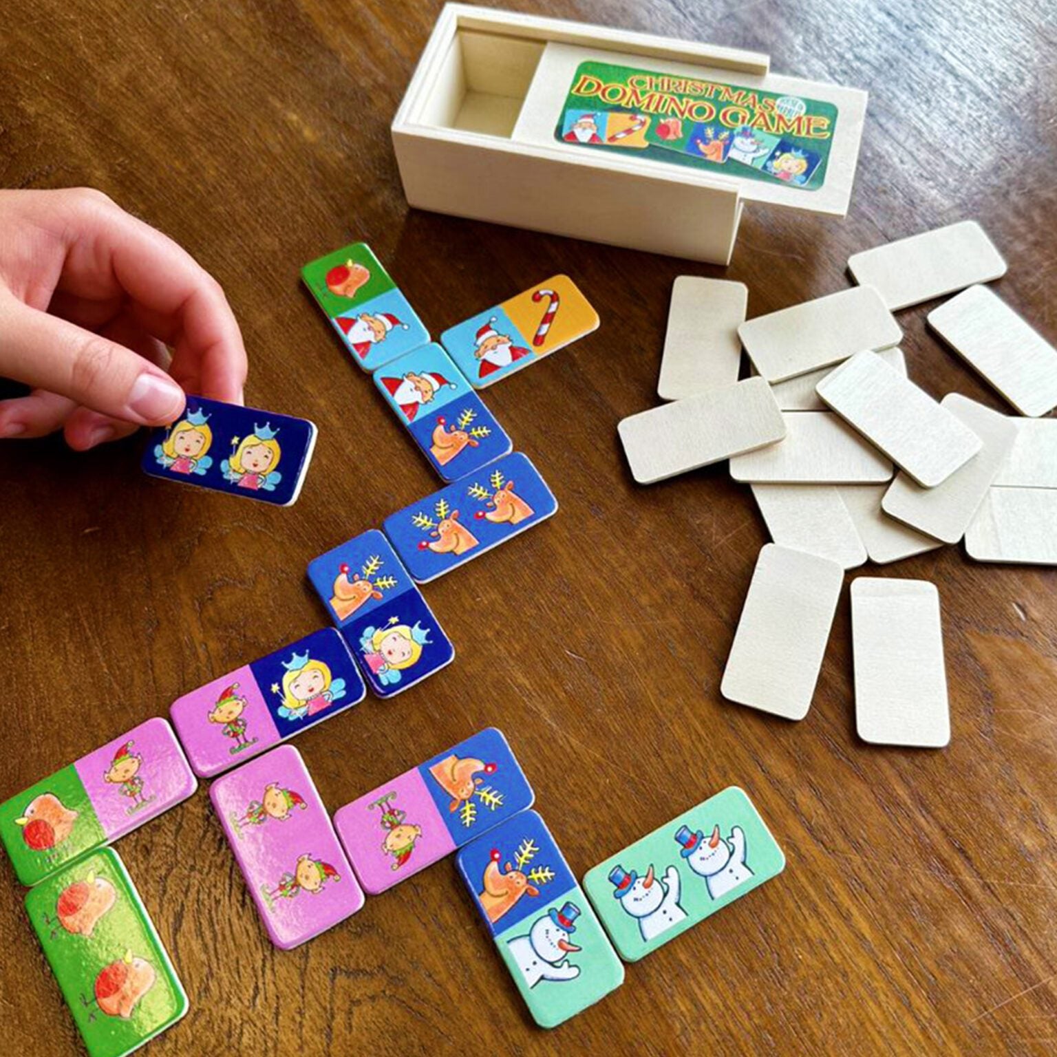 Explore the exciting world of strategy, skill and luck with our festive-themed dominoes crafted with younger players in mind. These colourful pieces are packaged in a sturdy wooden box that presents them beautifully and offers a convenient storage solution. Allow their imagination to soar as they explore the pure delight of playing with these decorative tiles, bringing forth hours of laughter and excitement.