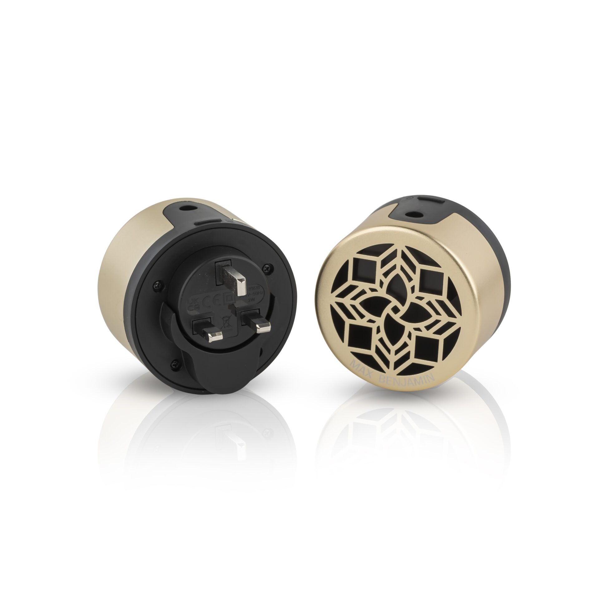 2 – (B) Remove the front gold cover . (C) Gently insert the bottle of fragranced oil into the back part of the device until you hear a ‘click’. Put the front gold cover back on.
