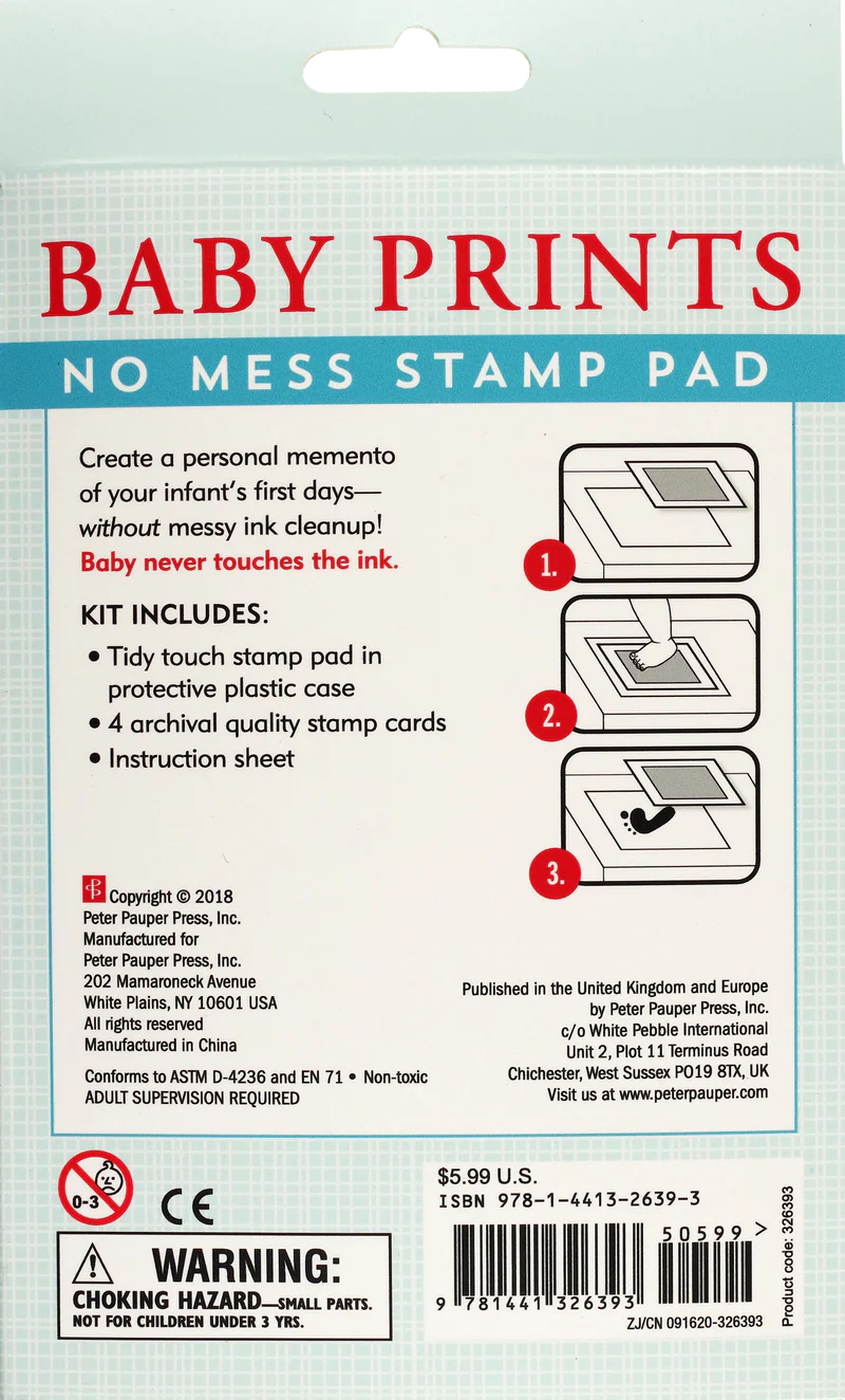 • Simple and easy-to-use kit includes a no-mess tidy-touch stamp pad. Baby never touches the ink!