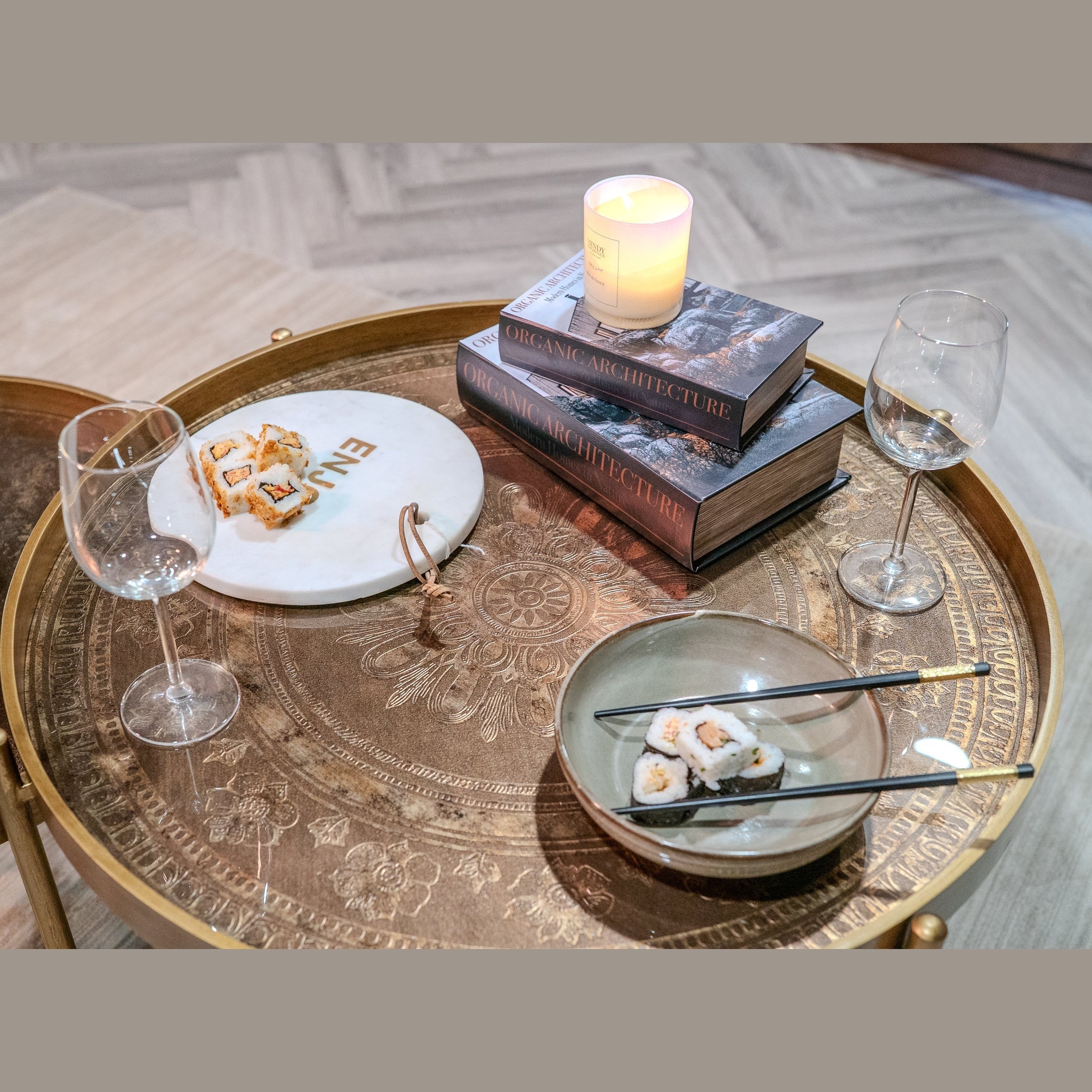 Sophisticated in form and rich in detail, this etched brass coloured coffee table is a refined centrepiece for the elevated living space. Featuring a delicately engraved tabletop with an ornate floral medallion design, the lustrous antique brass finish exudes timeless elegance and old-world charm.