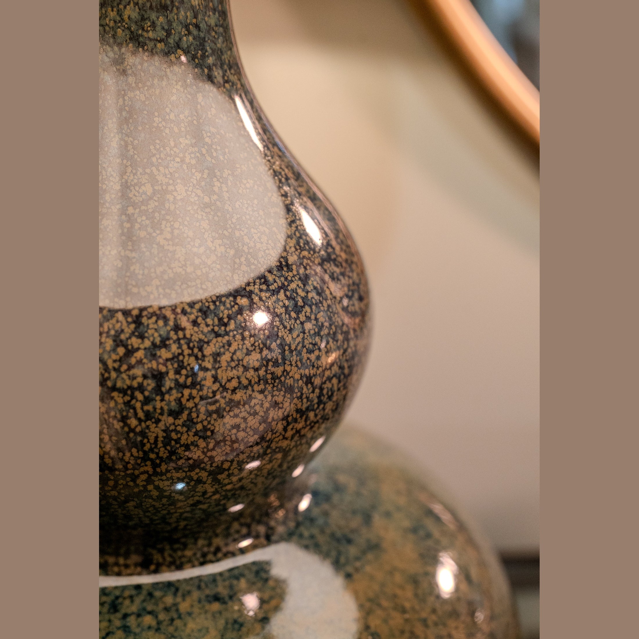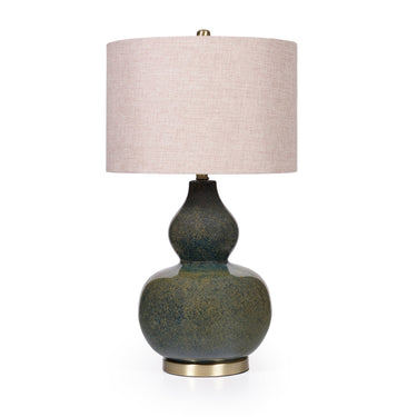 Refined form meets artisan craftsmanship in this exquisite ceramic table lamp. Featuring a sculptural double-gourd silhouette with a rich, mottled glaze in deep green and blue undertones, the base rests elegantly on a brushed brass foundation—adding a touch of quiet luxury.