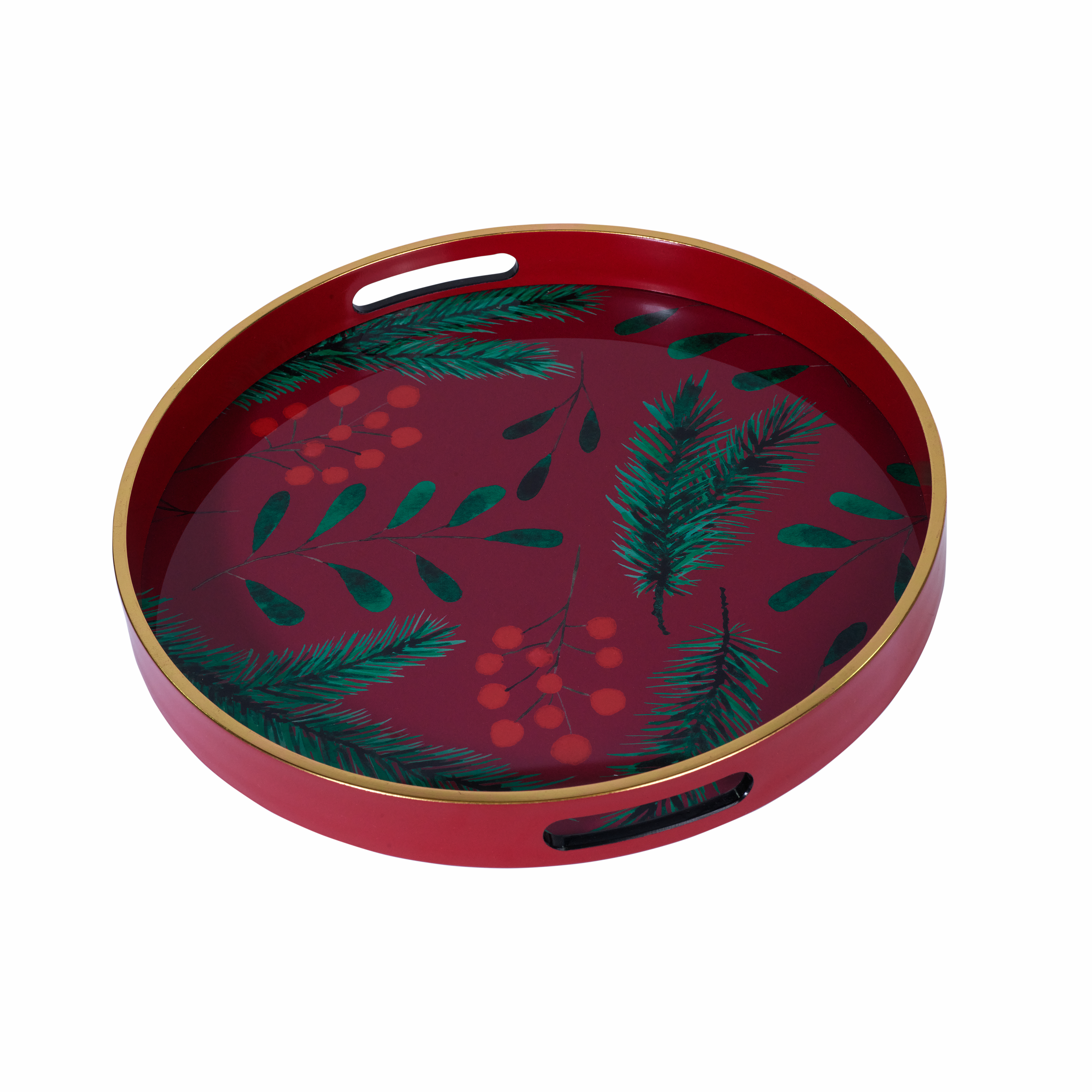 A stunning circular tray, with a rich red surround, gold rim, and a Christmas design in red, green, and gold. An ideal styling accessory this Christmas season.