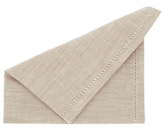 Set of 4 linen look napkins finished with a needled out border in 100% cotton chambray in a natural colourway. Set of 4.