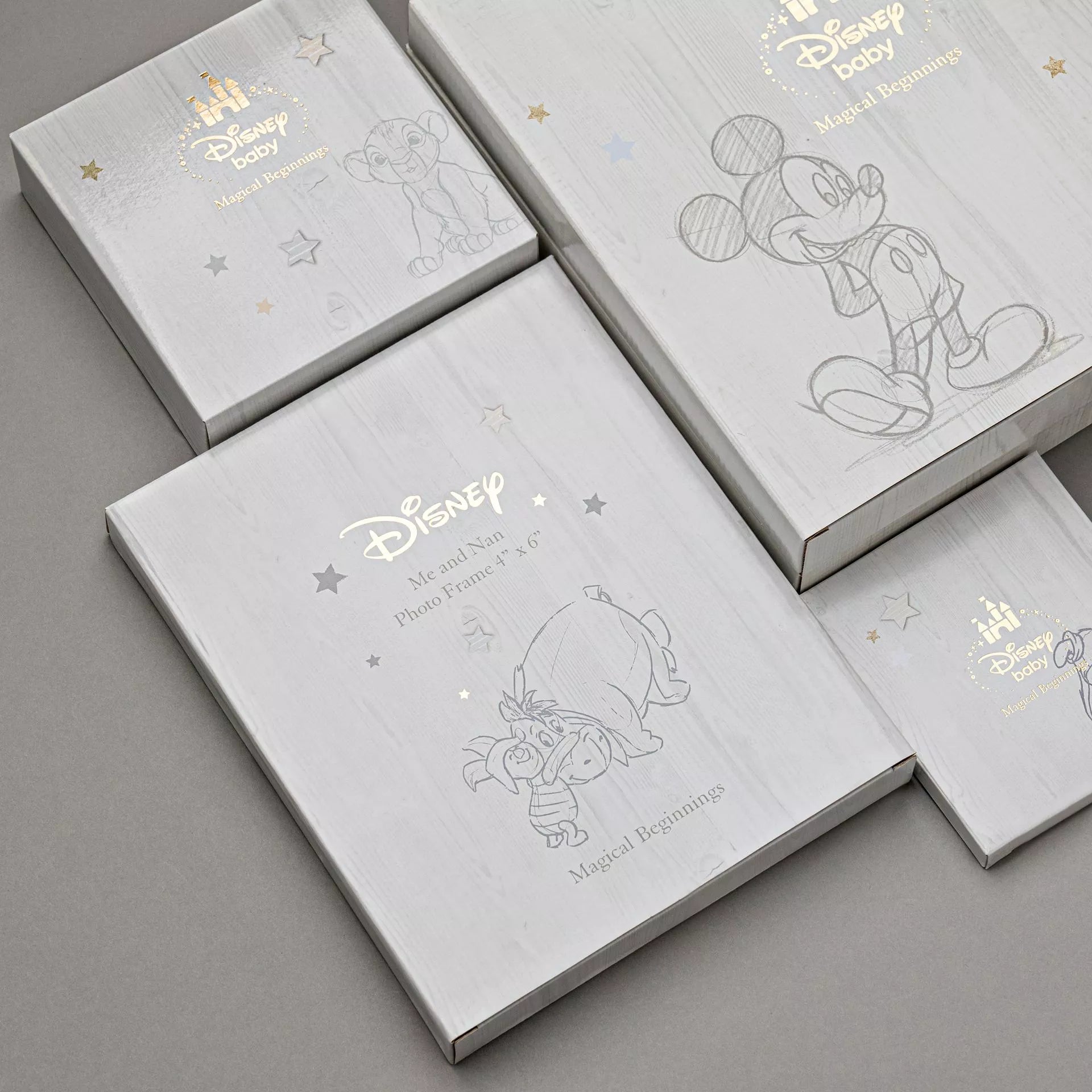 A Pooh adventure photo frame from DISNEY®. This adorable Magical Beginnings frame makes a treasured keepsake designed with babies in mind. It displays a beautifully printed image of the much-loved Winnie the Pooh and Piglet, complete with ‘Let the adventures begin’ sentiment in gold lettering. The freestanding frame features a single portrait aperture and would make a delightful gift for those who have recently welcomed a new bundle of joy into their home. The frame is packaged in a Disney foiled closed box.