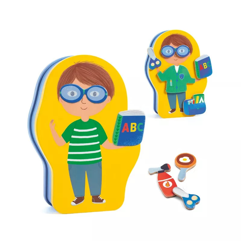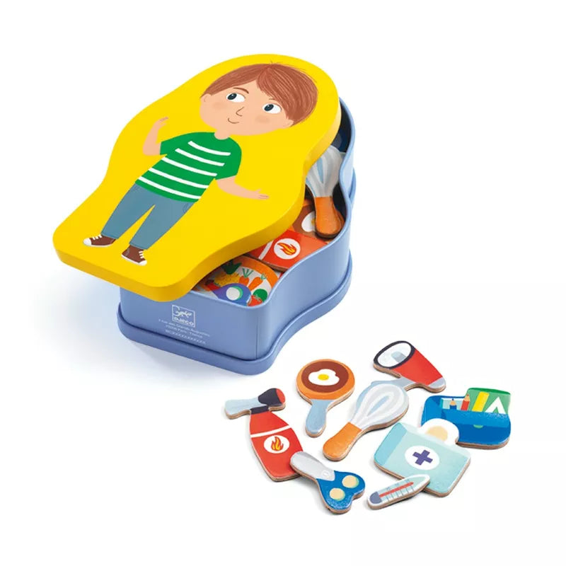 The Inzebox collection is so fun and practical! What do people wear in their jobs? A boy on one side of the box and a girl on the other can be dressed up ready for work: a doctor or a fireman, a cook or a teacher. At the end of the game, the child can store all the parts away in the box.A new way of playing with magnets!The Djeco Jobissimo Metallic Box with Wooden magnets contains 20 pieces.Perfect from 3 years old.