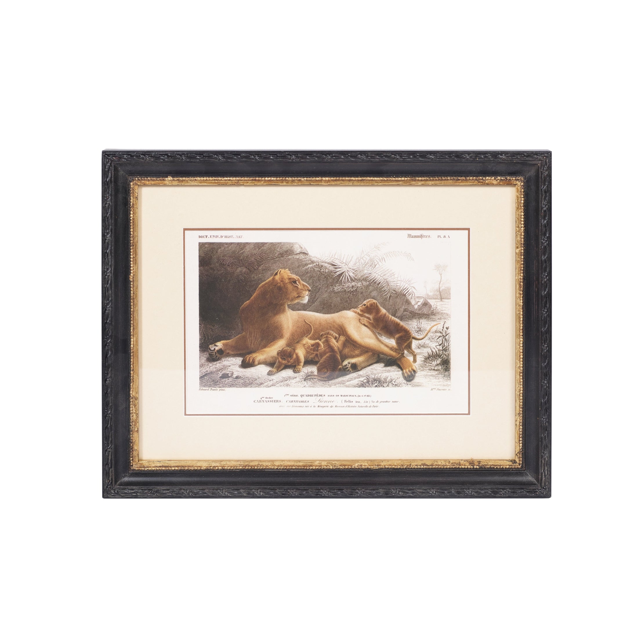 Add a touch of worldly charm with this vintage-style Lion illustration, beautifully framed in a distressed black and gold-edged frame. Inspired by antique zoological prints, it brings character, history, and a hint of safari sophistication to any gallery wall, study, or living space.