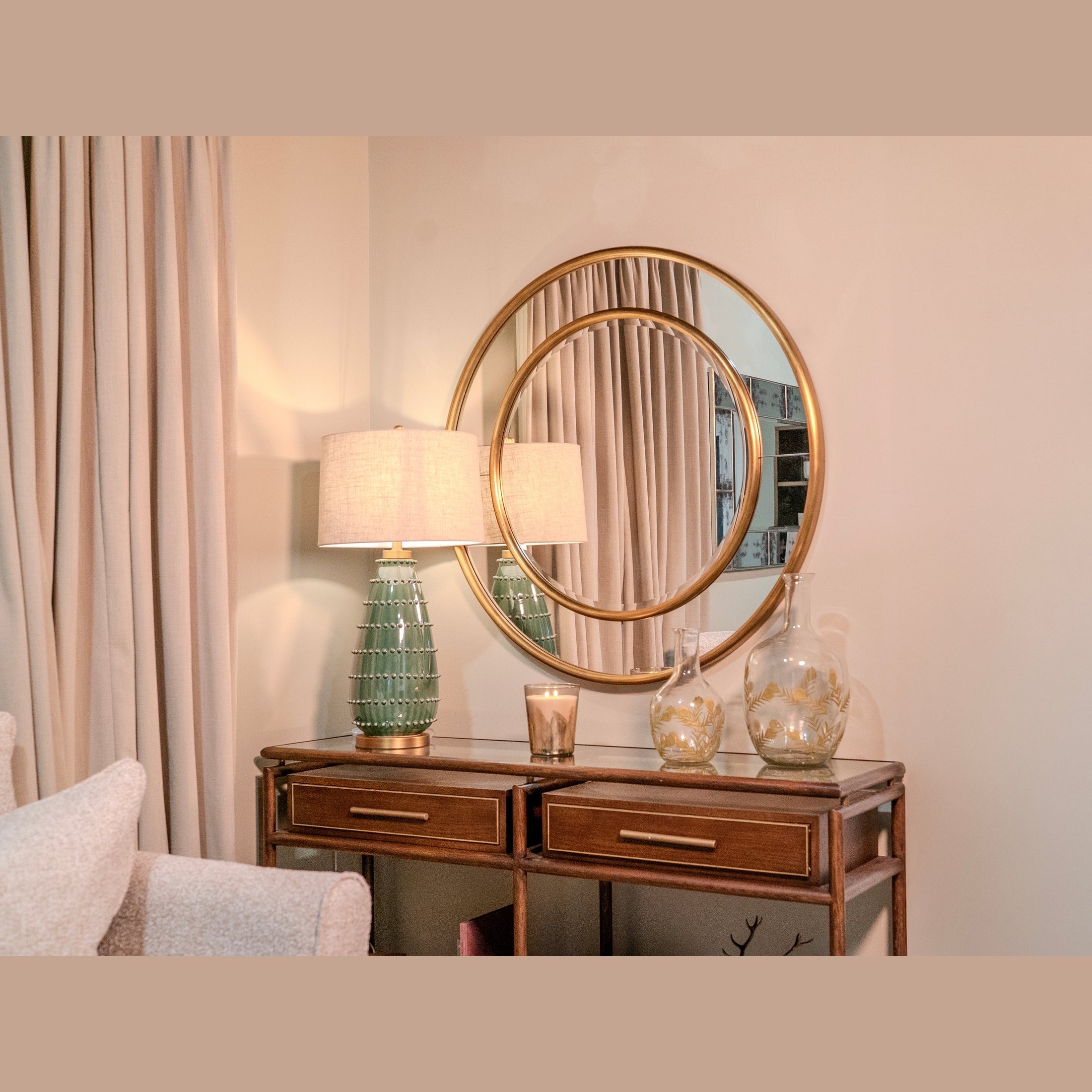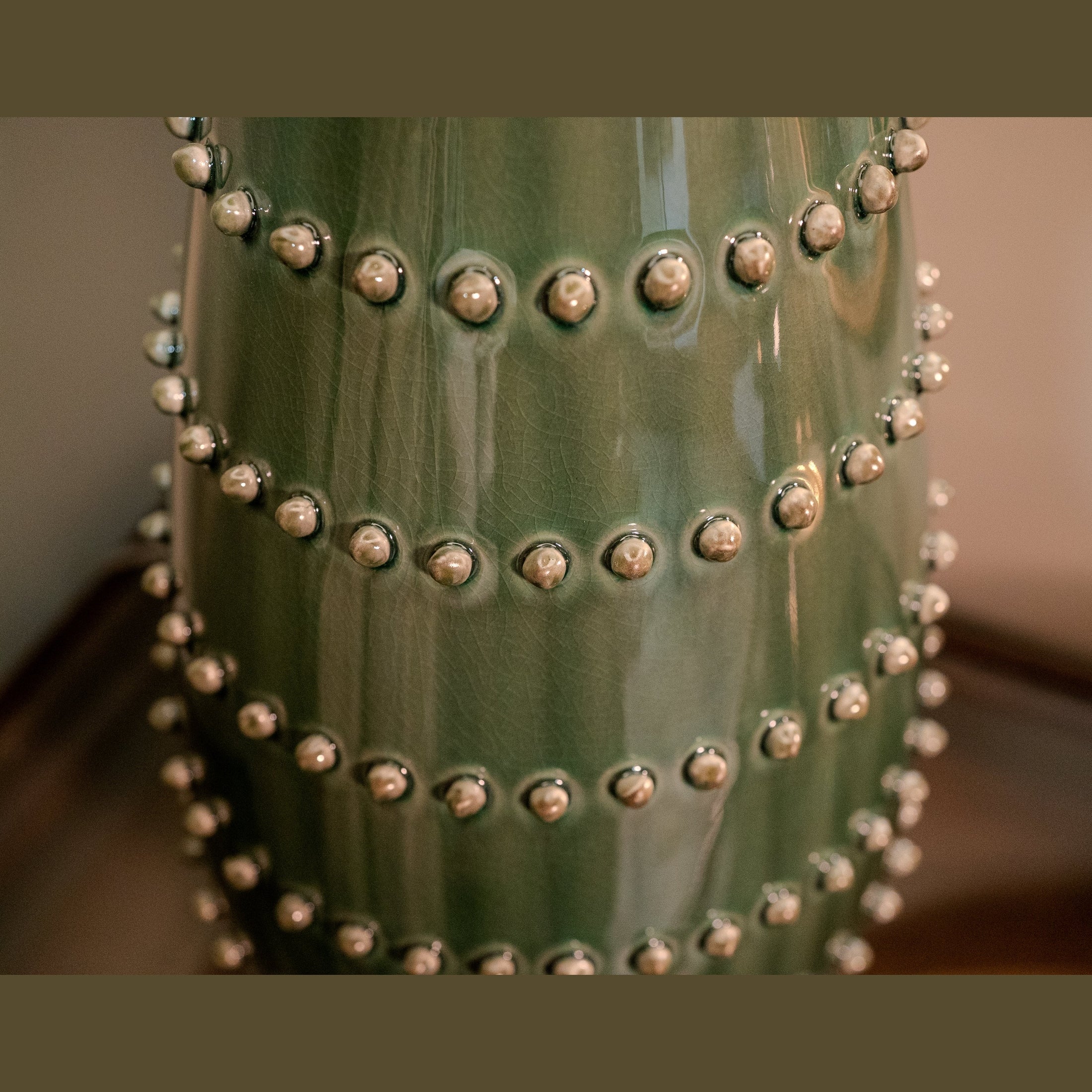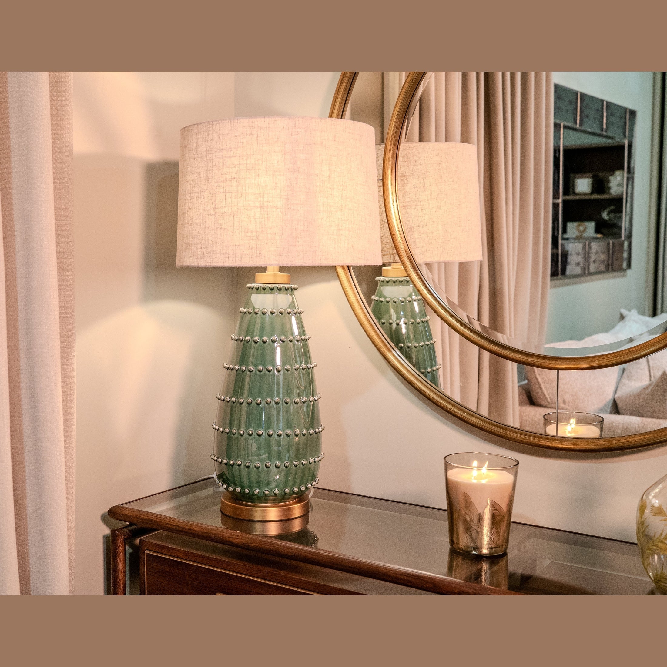 Bold and sculptural, the Maryam Green Lamp boasts a stacked geometric form. Accented with brass-tone detailing, this lamp commands attention while offering warm, ambient lighting. Perfect for interiors that embrace statement pieces think art deco, eclectic, or modern glam. A showstopper on any console table, buffet, or nightstand. This lamp also comes in off white.